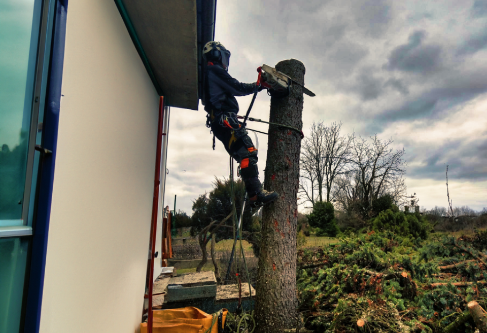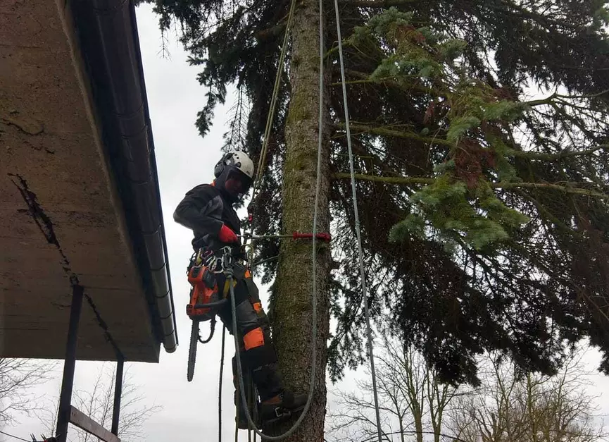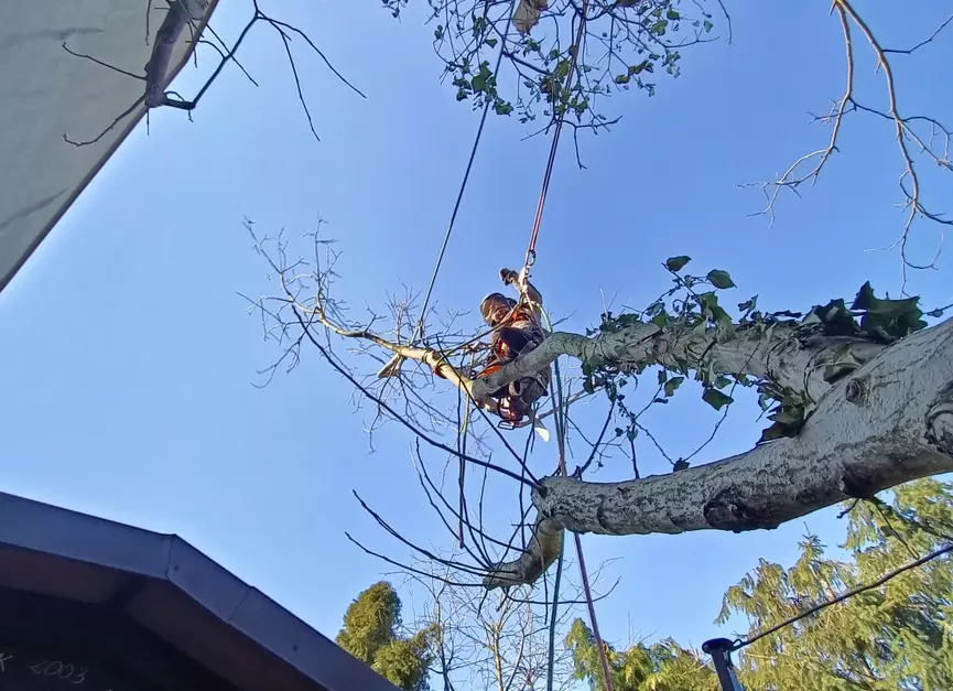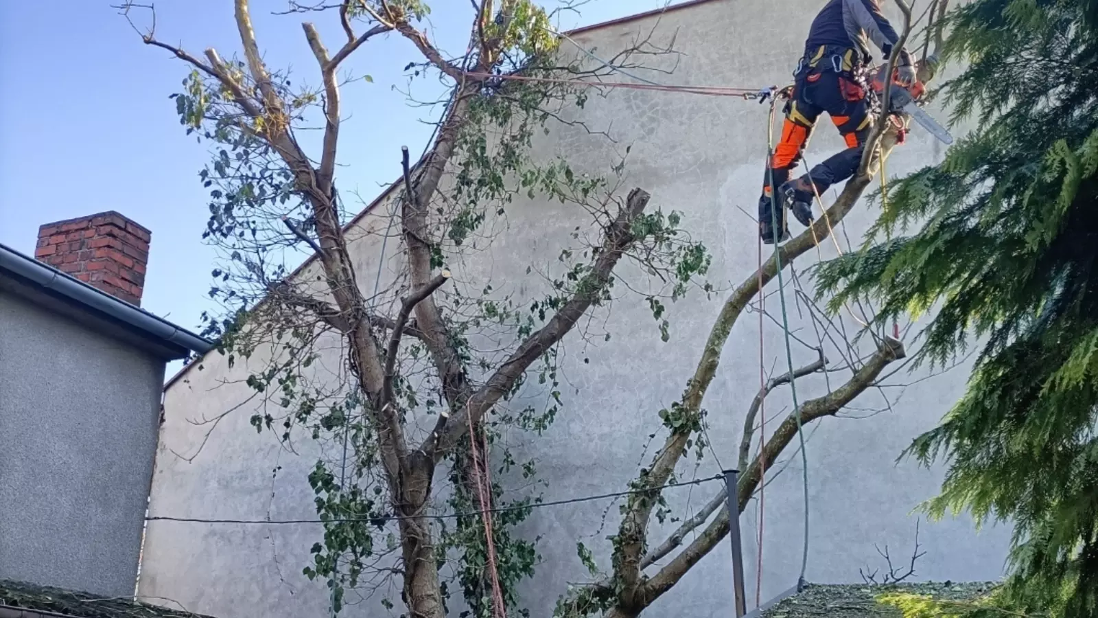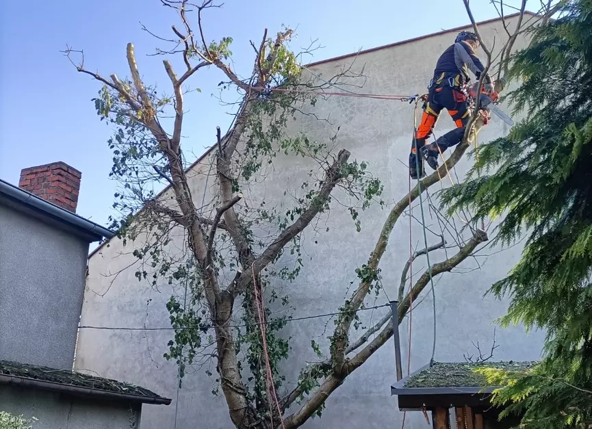 Prace wykonuję metodami linowymi, bez ciężkiego sprzętu, co pozwala działać bezpiecznie nawet w ciasnych ogrodach, przy budynkach i liniach energetycznych, minimalizując zniszczenia terenu.